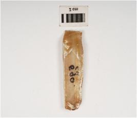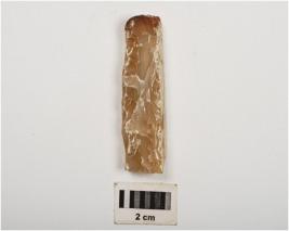 | Description / विवरण | Raw material of carnelian stone, long rectangular in shape and section with smooth and chipped off surface, raw material given heat treatment, fine wavy bands cortex visible at one end and broken at other end. |