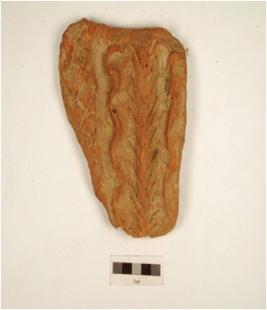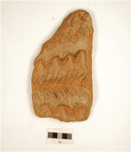 | Description / विवरण | Fragment of terracotta a indeterminate object decorated with projected rows in wavy design slanting strokes wavy design and criss-cross incised design on surface coarse fabric. |