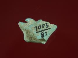 | Description / विवरण | Trench A-9, LxB-D 4 mtrs x 5.40 mtrs - 6.85 mtrs B peg ZA9, Stratum Layer 20 This is an unidentified object made of faience. Shape is irregular and is damaged badly. Appearance is of green colour. |