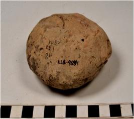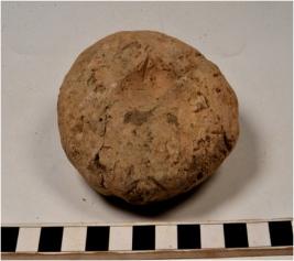 | Description / विवरण | A terracotta circular shaped cake having thumb impression on centre of rough surface. |