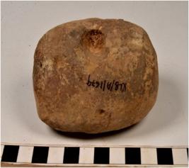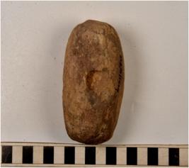 | Description / विवरण | A oval shape mushti type terracotta cake with rough surface having thumb impression on both sides of medium fabric and ill fired. |