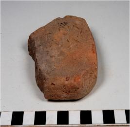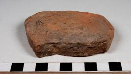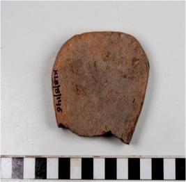 | Description / विवरण | A fragment of a terracotta triangular shaped cake of rough surface. |