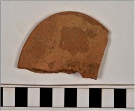 | Description / विवरण | A fragment of a handmade terracotta wheel with hub broken, smooth surface and fine fabric. |