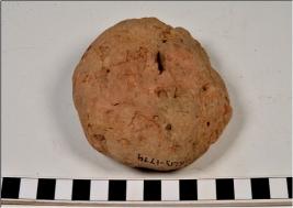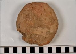 | Description / विवरण | A terracotta cake Idly type with circular in shape, having finger impression, rough surface, broken from one end. |