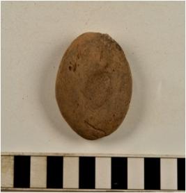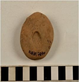 | Description / विवरण | A terracotta circular shaped cake having finger impression on both sides of rough surface. |