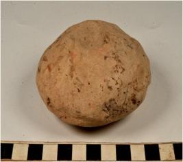 | Description / विवरण | A terracotta circular shaped cake having thumb impression on both side of rough surface. |