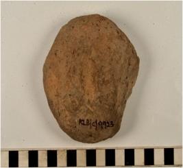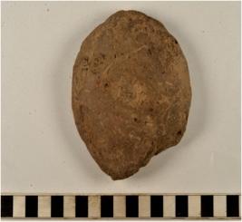 | Description / विवरण | A terracotta cake slightly broken from corner circular in shape having thumb impression on both sides of rough surface. |
