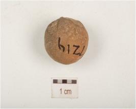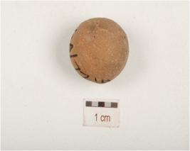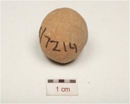 | Description / विवरण | Handmade terracotta sling ball, smooth slightly chipped off surface traces of chocolate slip and circular in section, |