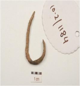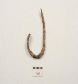 | Description / विवरण | A fragment of hook made of copper, pointed one end, other rectangular and curved on side, rough and chemically treated surface. |