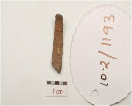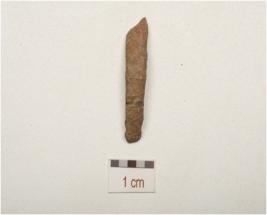 | Description / विवरण | A fragment of copper unidentified object , rectangular in section, rough surface, slightly curved and bent. |