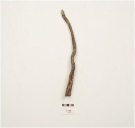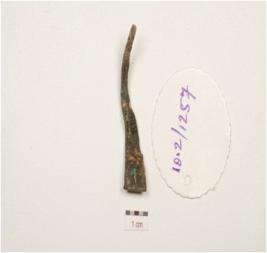 | Description / विवरण | Fragment of copper spike, pointed one end and flat on other end, flat and rough surface. |