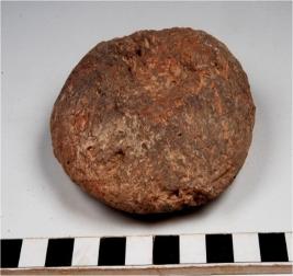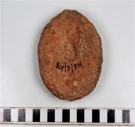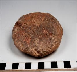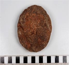 | Description / विवरण | A terracotta circular shaped cake having thumb impression on both sides of rough surface. |
