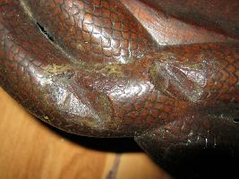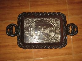 | Description / विवरण | This is a wooden tray having handles on both sides. Rim is modeled as four coiling snakes. From the rim and two hoods join face to face cut. Inner surface is designed with silver plate and a scene of a house near a foothill and a person shooting palet through a cata pult to a money. |