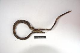 | Description / विवरण | Circular iron clamp with an elongated element of nail attcahed to it. Surface of the object is completly rusticated. |