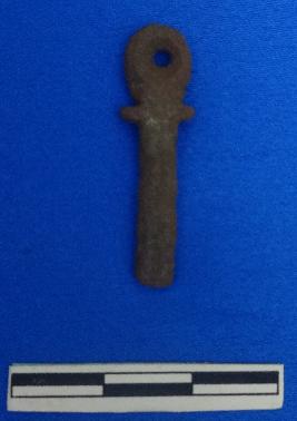 | Description / विवरण | A copper object with a short stalk, square sectioned with a perforated loop on the top, projection on either side below |