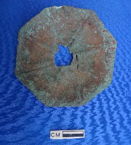 | Description / विवरण | An octagonal copper object of indeterminate use, of thin sectioned, the convex side having a pierced central hole designed with incised vertical lines. |