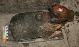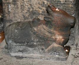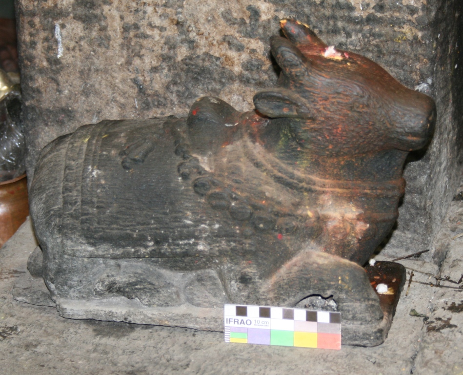Crouching Nandi with a garland of bells passing around his hump, in addition to a neck ornament and a saddle with ornamental border.