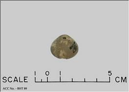| Description / विवरण | Arecanut shaped bead in dull grey colour. Depression around the perforations. |
