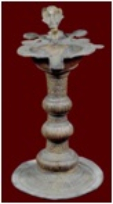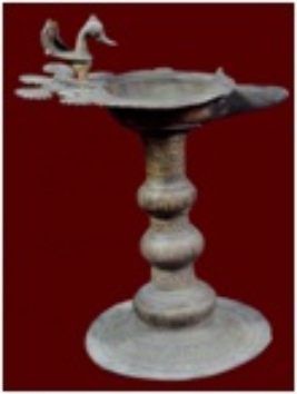 It s a lamp diya made by metal. Well decorated and used for religious purpose. A decorated peacock in upper portion and bottom portion is flat. Deposition of dust and patina