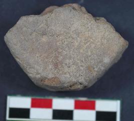 | Description / विवरण | Part of a cake with graffiti consists of two incised lines and a hole, having rough surface. It is Red in colour. |
