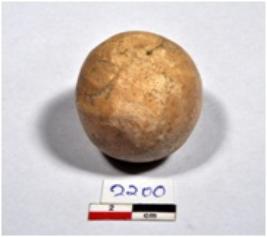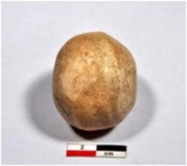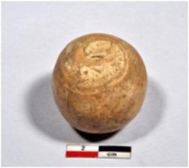 | Description / विवरण | A standard sized ball of shell showing globular shaped, cut mark on exterior, having rough surface. |