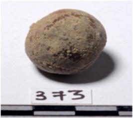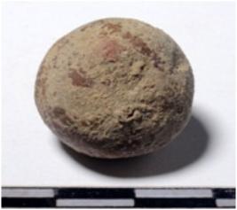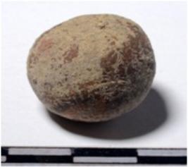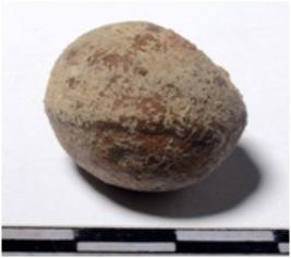 | Description / विवरण | A terracotta sling ball, round in shape of rough surface. |