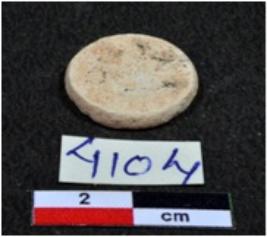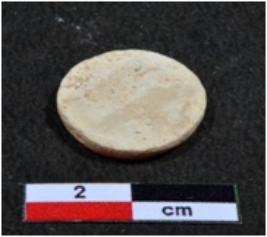 | Description / विवरण | A small sized inlay piece of shell showing disc shaped, circular in section, having rough surface. |