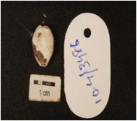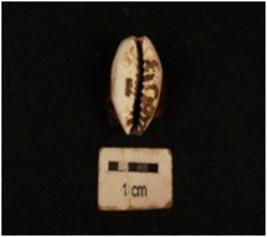 | Description / विवरण | Cowrie shell with a bulbus top and a natural groove on bottom, powdery surface. |