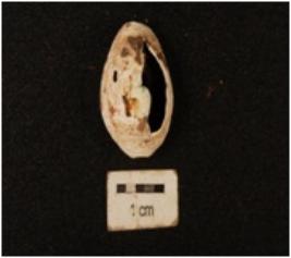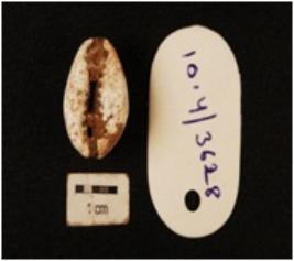 | Description / विवरण | Cowrie, natural marine shell object with powdery and partly broken surface, natural groove line at bottom with a hole and white in colour. |