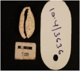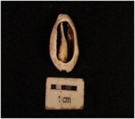 | Description / विवरण | Cowrie, natural marine shell object with powdery and partly broken surface, natural groove line at bottom with white in colour. |