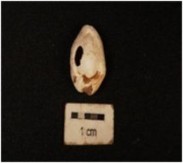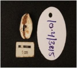 | Description / विवरण | A cowrie shell with natural groove at the base, powdary surface, off white in colour and slightly damaged exterior surface. |