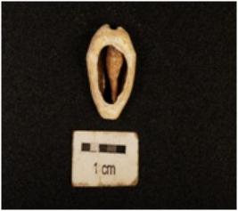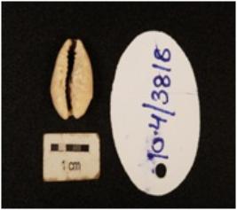 | Description / विवरण | A cowrie shell with natural groove at the base, powdary surface, off white in colour and damaged in the exterior surface. |