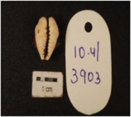 | Description / विवरण | A cowrie shell natural marine object with natural groove, powdered surface, white in colour. |