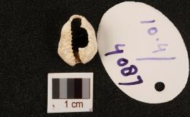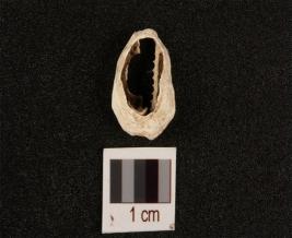 | Description / विवरण | A shell cowrie, a natural marine object with natural groove powdery surface, damaged from exterior surface. |