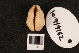| Description / विवरण | Natural shell cowrie with one side bulbous and grooved on other, dusty surface. |