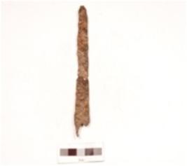 | Description / विवरण | An indeterminate iron object, uneven surface, flat from bottom, head and tip is missing rusted. |