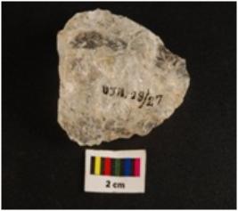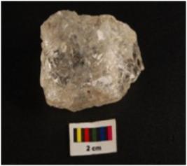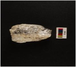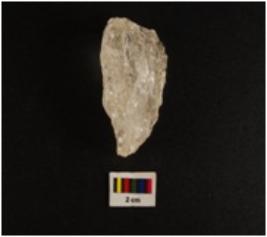 | Description / विवरण | Fragment of modify quartz object, uneven shape, rough surface, translucent by nature. Stain on surface. |