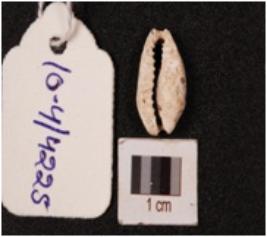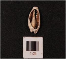 | Description / विवरण | A cowrie shell with natural groove at base, powdery surface, white in colour and damaged in the exterior. |