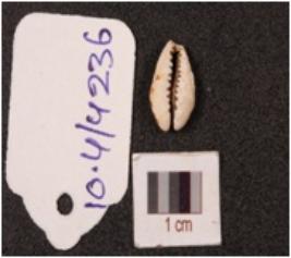 | Description / विवरण | A cowrie shell with natural groove at base, powdery surface, off white in colour and damaged in the exterior. |