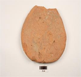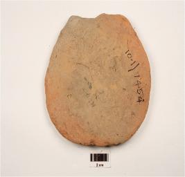 | Description / विवरण | A handmade cake made of terracotta made of well levigated clay, flat and circular shaped, well baked, husk impression on surface, partly broken side. |