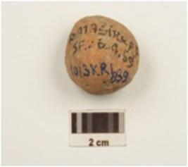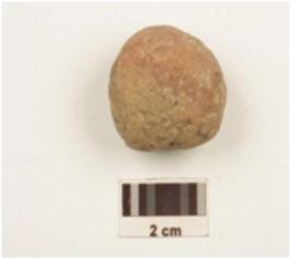 | Description / विवरण | Fragment of a handmade sling ball treated with red slip on the surface. |