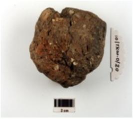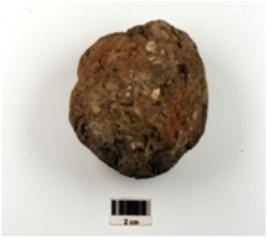 | Description / विवरण | Fragment of terracotta cake, chipped off surface and coarse fabric. |