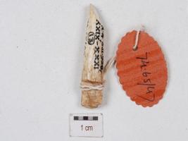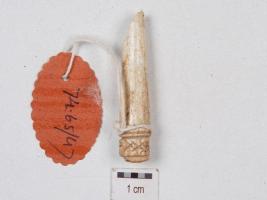 | Description / विवरण | Fragment of a stylus, made of ivory, broken pointed end, top end partly broken and decorated with incised design, circular section and polished surface. |
