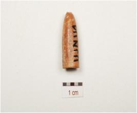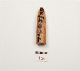 | Description / विवरण | A bullet shaped stylus cap made on bone with hole, polished surface and circular cross section. |