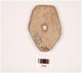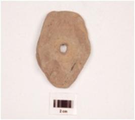 | Description / विवरण | A spindle whorl, made of pot sherd with a perforation at the centre, grey surface and partly broken. |