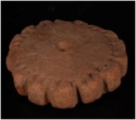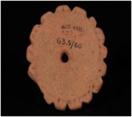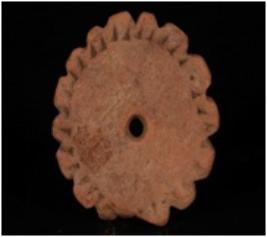 | Description / विवरण | Terracotta wheel with incised and grooved floral design on the edge. It has perforation on the centre. |