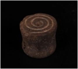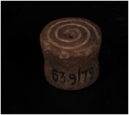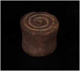 | Description / विवरण | Terracotta wheel with incised spiral design on one side and depression on other side. |