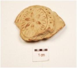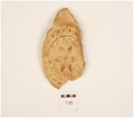 | Description / विवरण | A terracotta handmade unidentified object, floral decoration on surface treated with slip in red colour. |