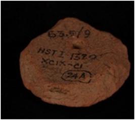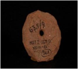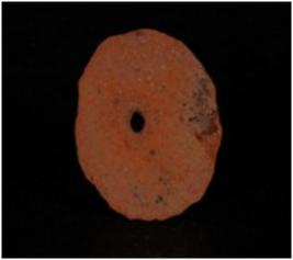 | Description / विवरण | Fragment of terracotta wheel with broken edge and a perforation on the centre. |