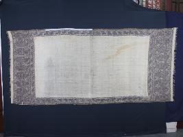 The famous kani shawl is an integral part of the history of Kashmir. The ground color is white, but blue the more commonly used in border design.